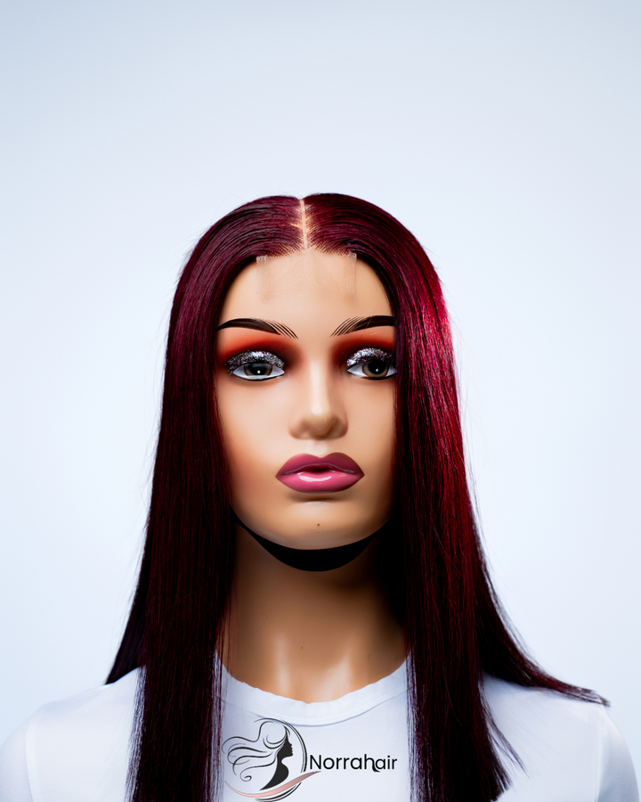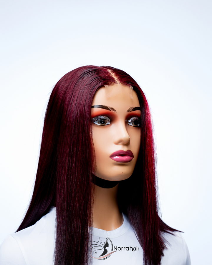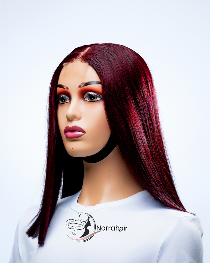 12” Burgundy Bone Straight Wig made from 100% Virgin Vietnamese Hair with a (2x6) closure for a natural look and easy wear.