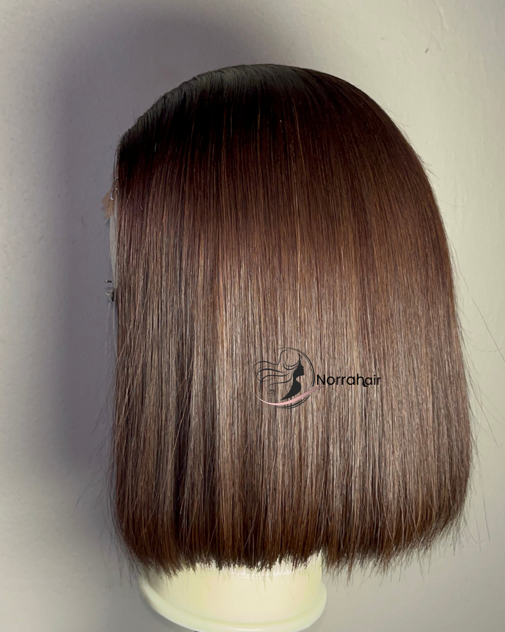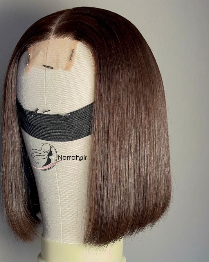 10” Dark Brown Bone Straight Wig made from 100% Virgin Vietnamese Hair with a 2x6 closure for a natural look and easy wear.